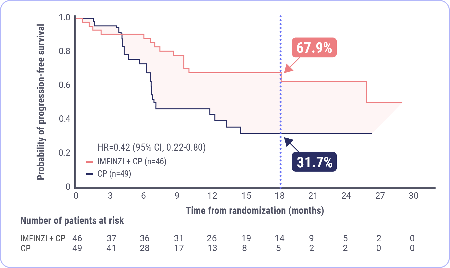 At 18 months, 67.9% of patients were estimated to be alive and progression free in the IMFINZI + CP arm and 31.7% were estimated to be alive and progression free in the CP arm.