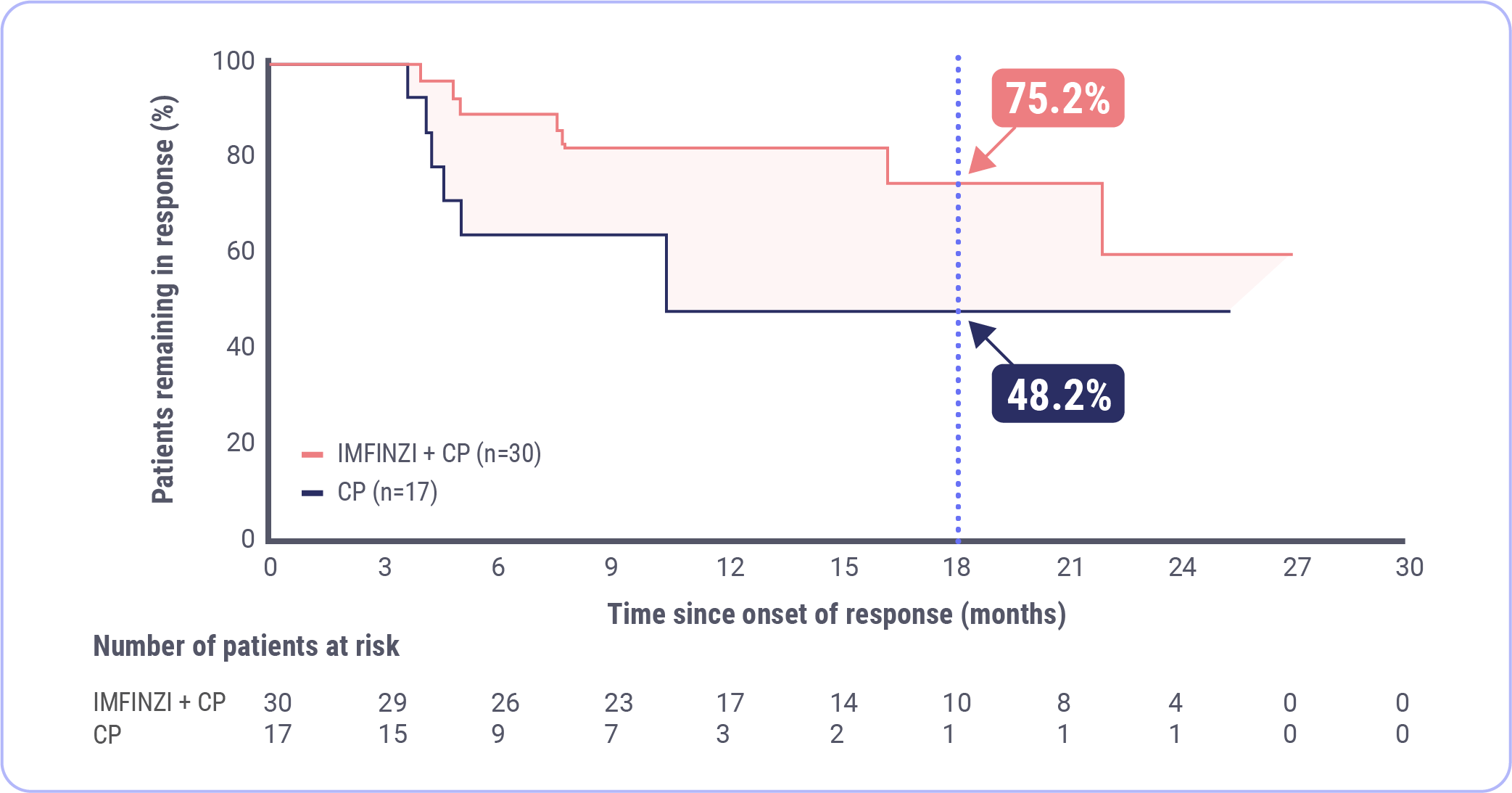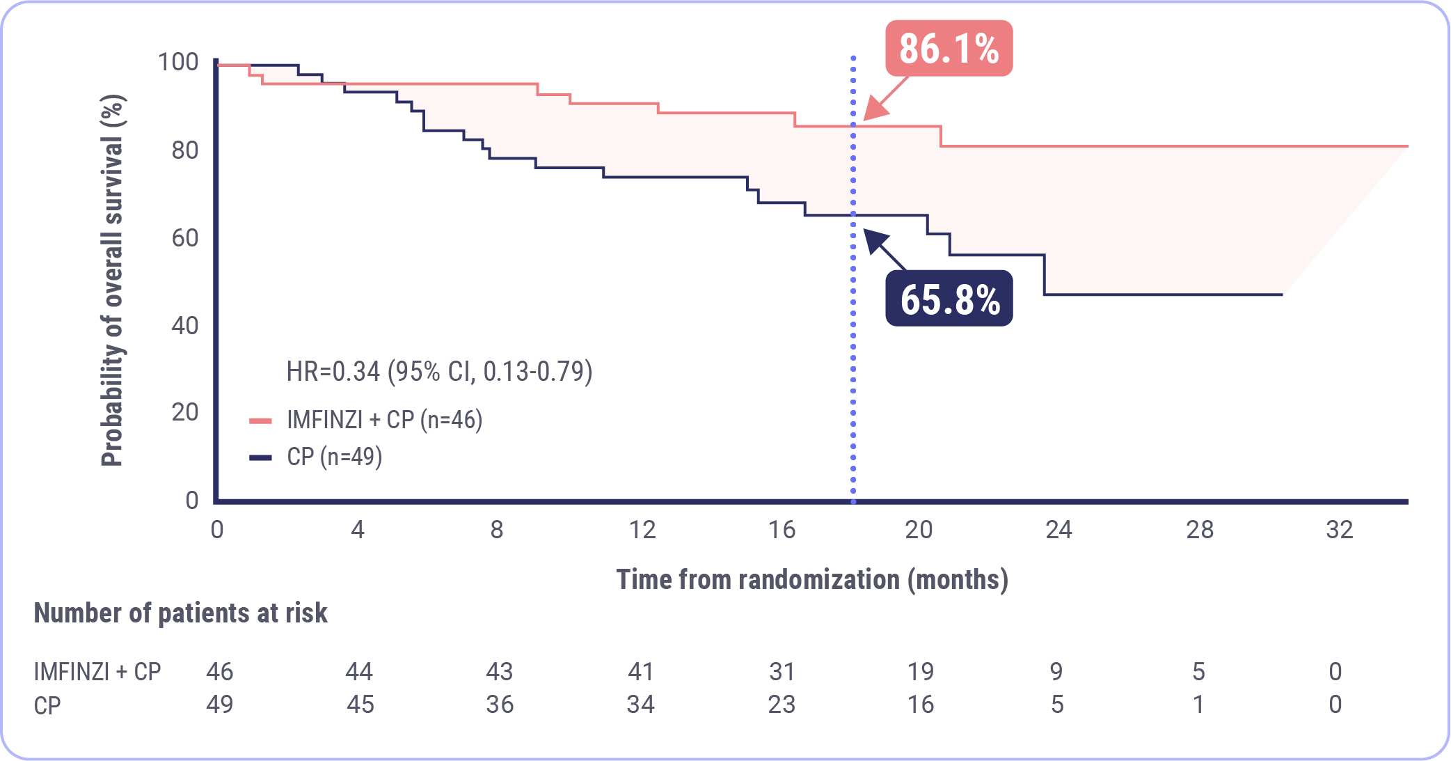 At 18 months, 86.1% of patients were estimated to be alive in the IMFINZI + CP arm and 65.8% were estimated to be alive in the CP arm.